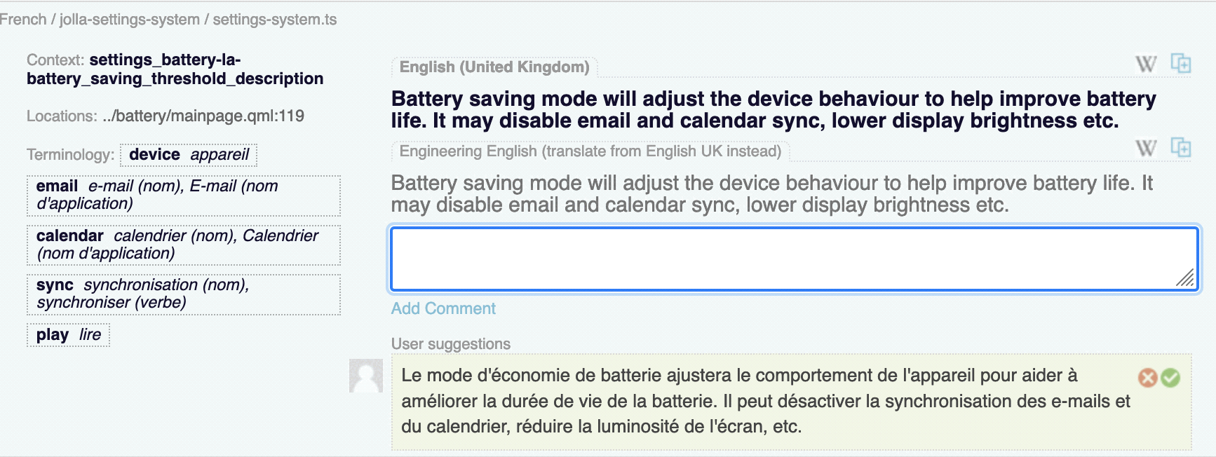 Here is how the translation looks like: for each string, you usually have a context, and a textbox where you can type your translation. Below, if a user has submitted a suggestion, you can review it and accept or reject it:
